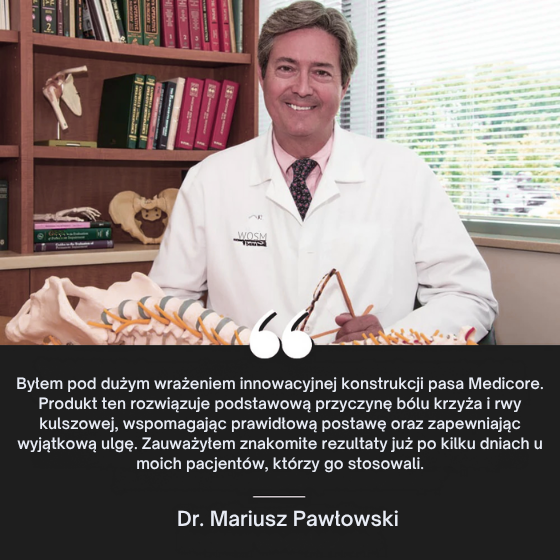 Pas ortopedyczny MediCore™ został specjalnie opracowany, aby przywrócić kręgosłupowi naturalne ustawienie i równomiernie rozłożyć nacisk na wszystkie kręgi.